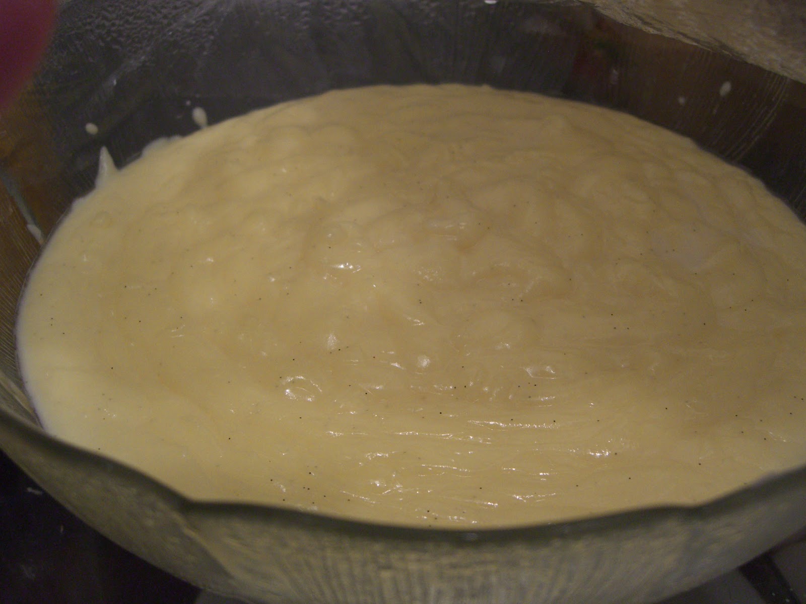 Combine 2 cups of the cream, the milk, 1/2 cup of the sugar, the vanilla bean, and the vanilla seeds in a large heavy-bottomed saucepan over medium heat. Bring to a gentle boil, whisking to dissolve the sugar. Remove from the heat. Combine the egg yolks, eggs, cornstarch, and 1 cup of the sugar in a medium bowl, and whisk pale yellow in color. Set aside.Whisk 1 cup of the hot cream mixture into the egg yolks. Gradually add the egg mixture to the hot cream, whisking constantly. Bring to a simmer, stirring constantly with a large wooden spoon to cook out the cornstarch and the mixture thickens, about 5 minutes. (The mixture may separate slightly. If so, remove from the heat and beat with an electric mixer until thick and smooth.) Strain through a fine mesh strainer into a clean bowl. Cover with plastic wrap, pressing down against the surface to prevent a skin from forming. Chill in the refrigerator for about 4 hours.