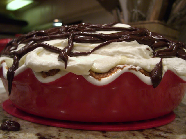 To assemble the pie spoon some of the vanilla pudding into the pie crust. Add, 1 1/2 cups sliced bananas covering the pudding. Cover the bananas with remaining pudding. Top with whipped cream and drizzle with chocolate sauce. Use extra chocolate sauce to decorate each serving dish.